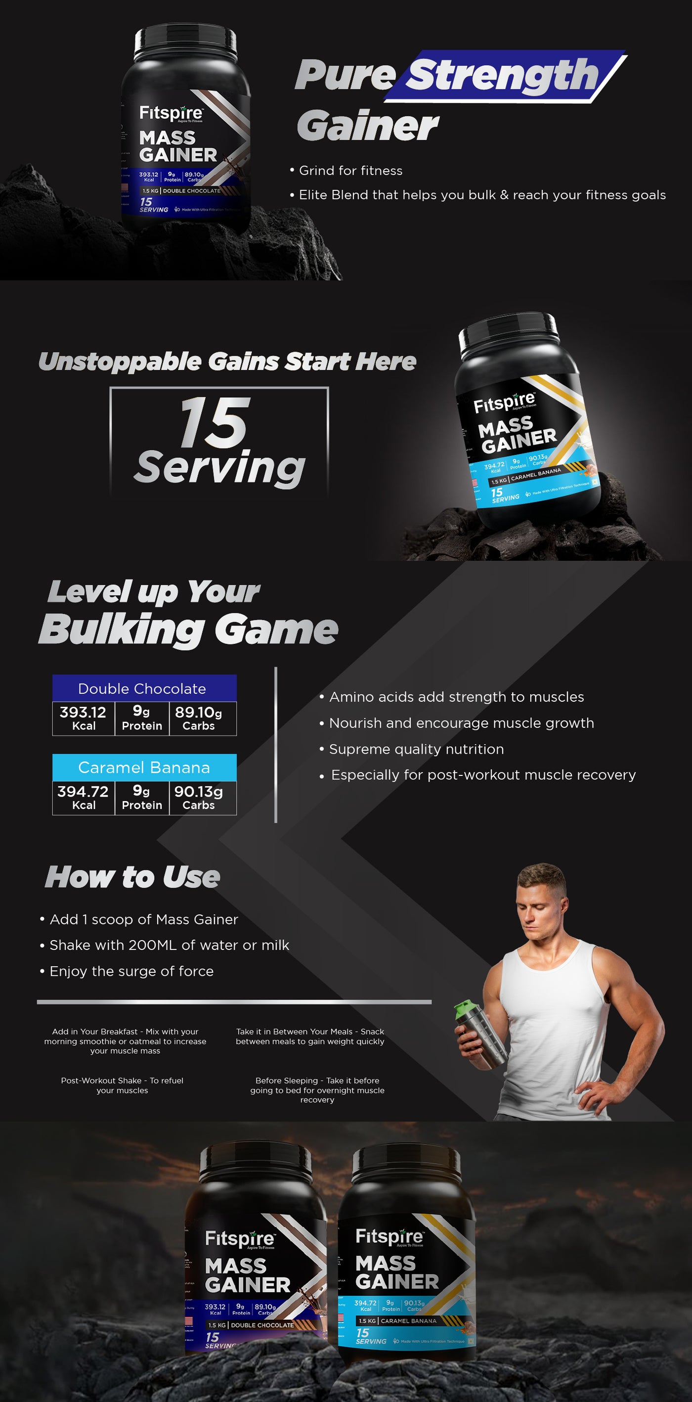 Fitspire Mass Gainer is a protein supplement designed to support muscle gain and bodybuilding. It provides a convenient way to increase protein intake without relying solely on protein-rich foods, which can be challenging to consume in large amounts while maintaining a balanced diet.